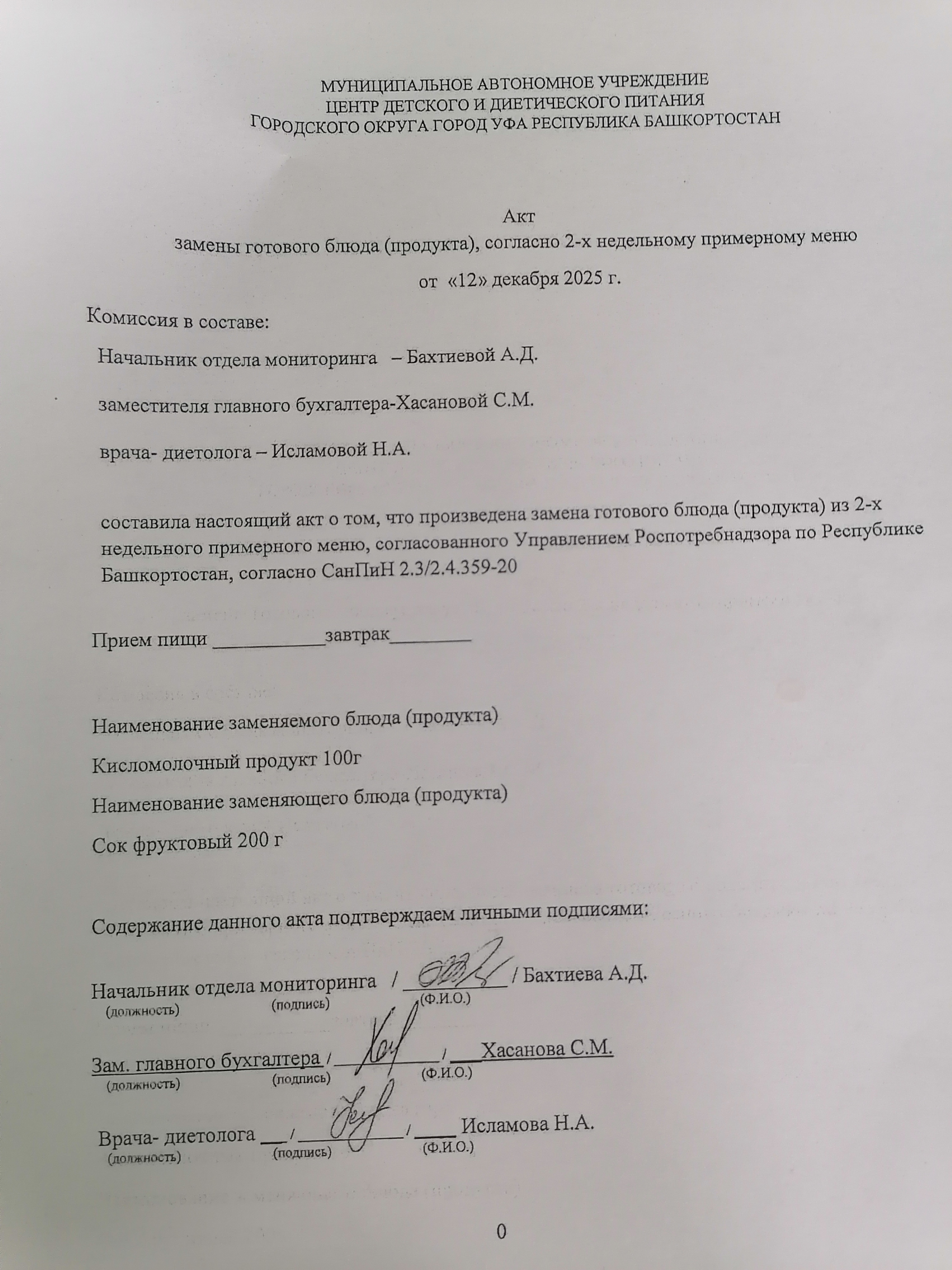 Акт замены готового блюда от 12.12.2025г.